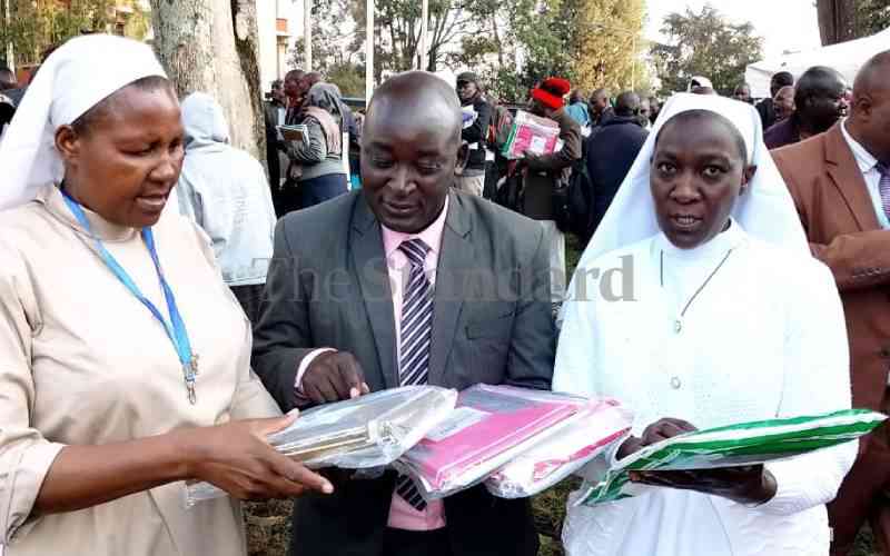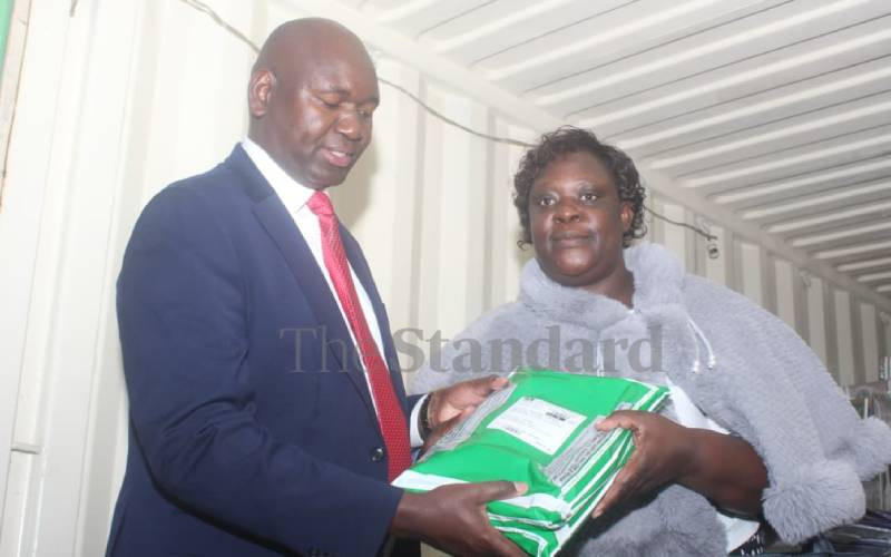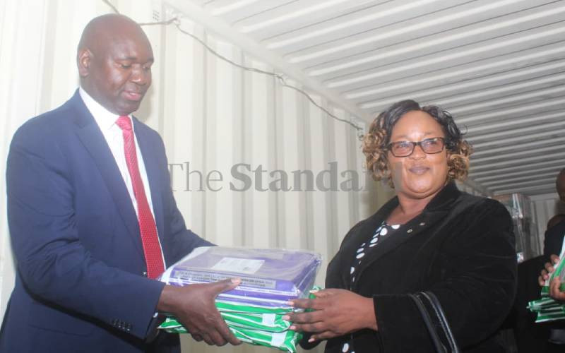 Basic Education Principal Secretary Julius Bitok hands over examination papers to a school head.