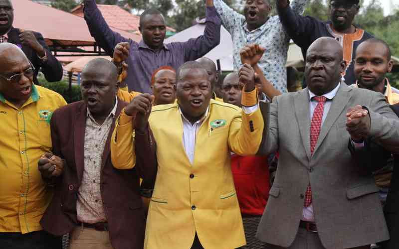 KUPPET Secretary General Akello Misori, addressed the press, at Kasarani Sportview flanked by Kenya Union of Post Primary Teachers (KUPPET) National chairman Omboko Milemba and Kuppet Vice Chairman Julius Korir.[Edward Kiplimo, Standard]