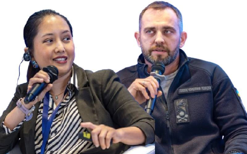 Munira Mustafa, CEO, Chasseur Group research and Gen Dmytro Usov, Secretary Prisoners of War, Military HQ-Ukraine addressing an international sitting discussing Russia's war on Ukraine. [Wellingtone Nyongesa, Standard]