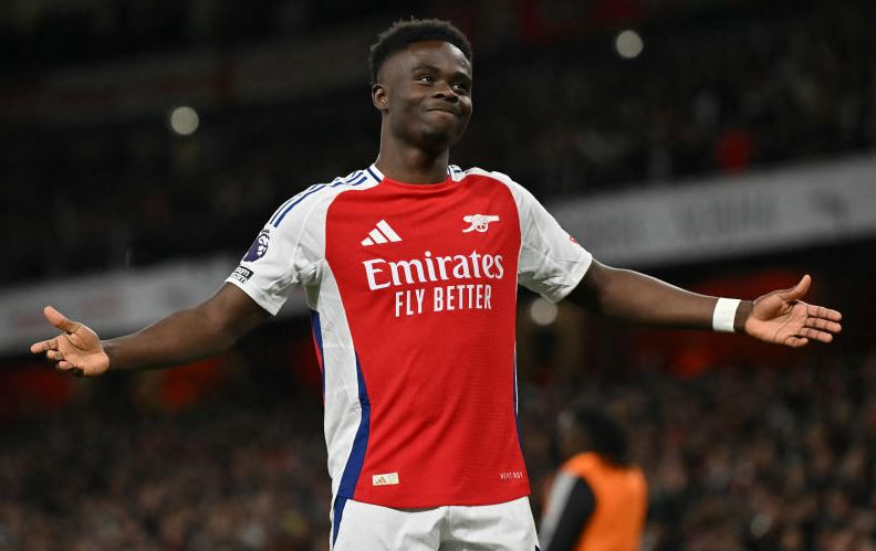 Arsenal's English midfielder #07 Bukayo Saka celebrates scoring the team's second goal during the English Premier League football match between Arsenal and Fulham at the Emirates Stadium in London on April 1, 2025. (Photo by Glyn KIRK / AFP)