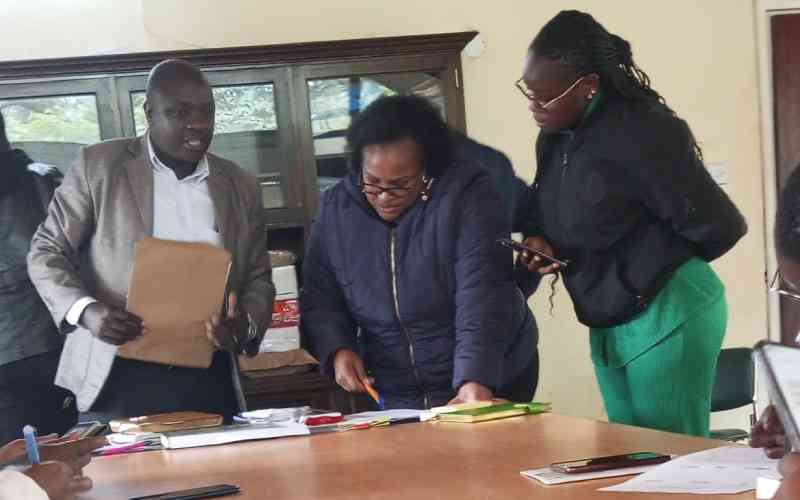 Joseph Kagwina (left) and Laboso Chepng'eno (center) the Westlands CDF fund manager during the tender opening at Westlands CDF office on Wednesday 31/7/2024. [Courtesy]