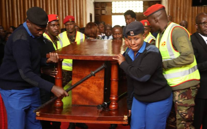 Security personnel remove the viewing table at Parliament ahead of former Raila Odinga’s canceled ‘lie in state’ viewing, which has been moved to Kasarani on Thursday, October 16, 2025. [Elvis Ogina, Standard]