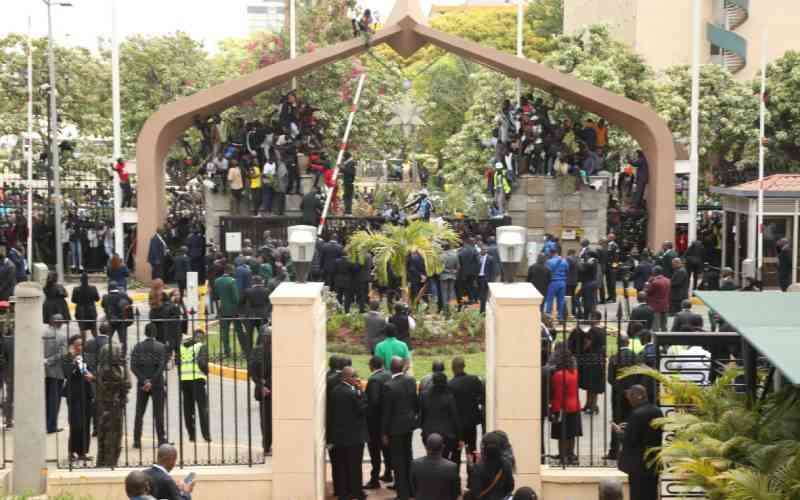 Mourners gather at the gate of Parliament ahead of Raila Odinga’s public viewing, which was initially planned for Parliament but moved to Kasarani Sports Complex following a crowd surge on October 16, 2025. [Elvis Ogina, Standard]