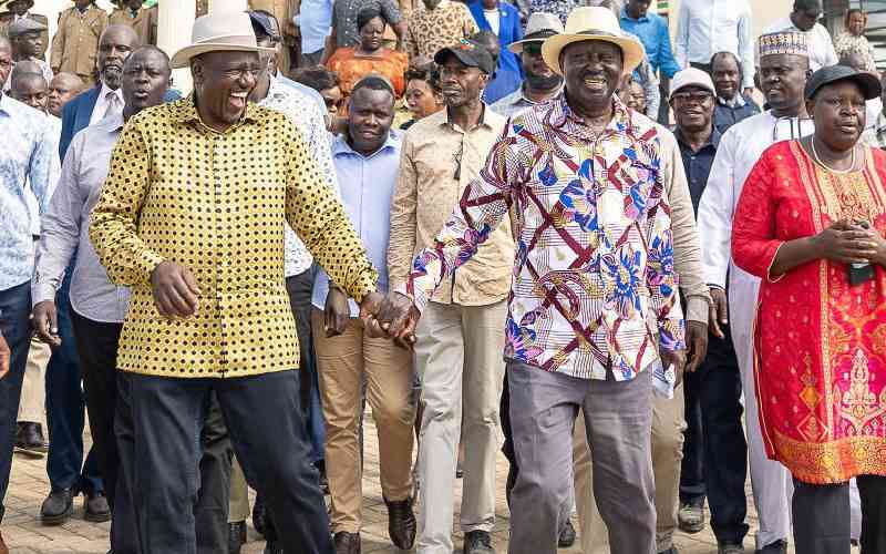 President William Ruto and former Prime Minister Raila Odinga during the official opening of the Sub-County Headquarter Offices in Rangwe, Homa Bay county, on May 30, 2025. [File, Standard]