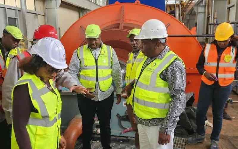 The PS for Energy Alex Wachira (C) joins senior Kengen officers and contractors in touring Olkaria I power plant in Naivasha which is currently undergoing rehabilitation with plans to pump 63mw into the national grid once complete. [Antony Gitonga, Standard]