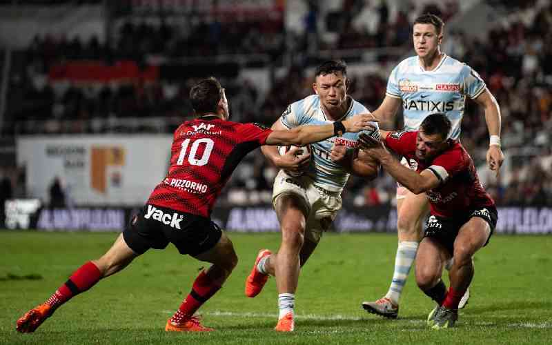Toulon's Italian fly-half Paolo Garbisi is tackled by Racing 92' New Zealand center Joey Manu during the French Top 14 rugby union match at Stade Mayol in Toulon, France, on October 19, 2025. [AFP]