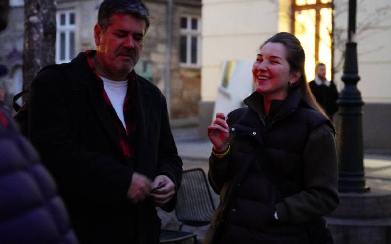 Kateryna Anhelova speaking to an Argeninian journalist at an event in Lviv.[Wellingtone Nyongesa/Standard]