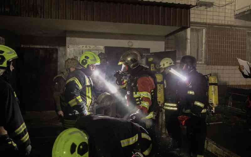 Firefighters outside a residential building on fire following a Russian drone attack on Vyshhorod, in the Kyiv region, on November 30, 2025. [AFP]