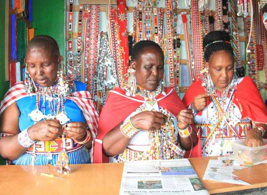 Several miles away in Kimana town, another group of women is similarly busy, this time inside a well-decorated shop. Six women, draped in traditional Maasai shawls, focus on beadwork as a youth supervises from outside.