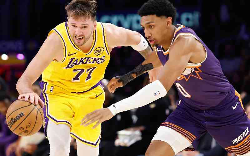 Luka Doncic of the Los Angeles Lakers controls the ball against Ryan Dunn of the Phoenix Suns in the second half at Crypto.com Arena on December 01, 2025 in Los Angeles, California. [AFP]