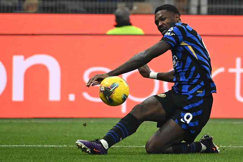 Inter Milan's French forward Marcus Thuram dives for the ball during the Italian Serie A football match between vs Bologna at the San Siro Stadium in Milan on January 15, 2025. (Isabella BONOTTO / AFP)
