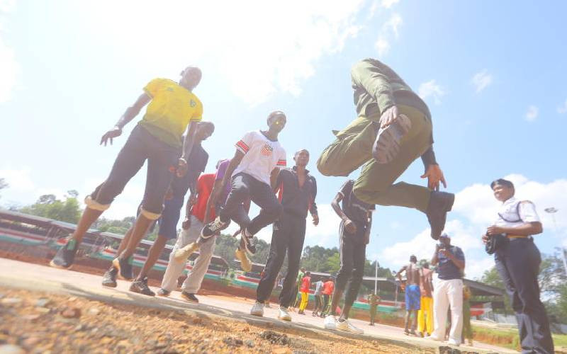 Police officer takes youth through physical exercise at Gusii Stadium during National Police Service recruitment on March 24, 2022. [File, Standard]