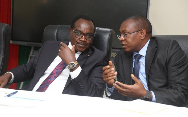 Education Cabinet Secretary Julius Ogamba and KNEC Chief Executive Officer David Njengere during the launch of 2025 national examinations and assessments. [Wilbrforce Okwiri, Standard]