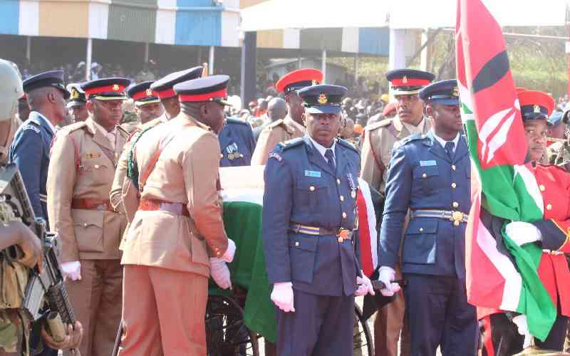 Military officers escort the body of former Prime Minister Raila Odinga during the funeral service at Jaramogi Oginga Odinga University in Bondo, on October 19, 2025. [Benjamin Sakwa, Standard]