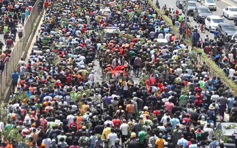 10:49 AM - Businesses in Nairobi CBD close or remain partially open amid fears of potential looting. Mourners carrying twigs blow whistles in a procession heading towards parliament.