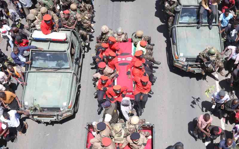 2:30 PM - Procession of Raila Odinga's body arrives at Kasarani Stadium amid chants from a mammoth crowd gathered at the facility. The 60,000 seater sports centre filled to full capacity.