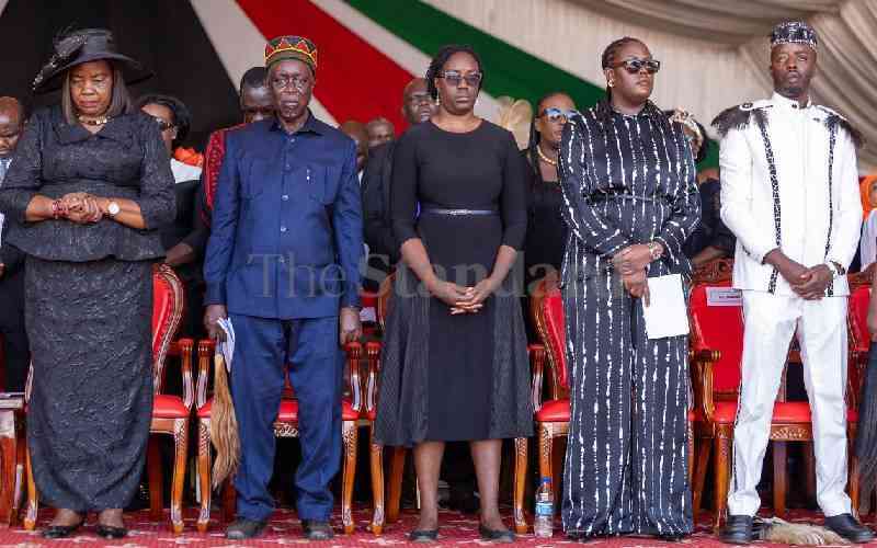 Family of the late former Prime Minister Raila Odinga and his brother Siaya Senator Oburu Oginga (second left) during the funeral service in Bondo on October 19, 2025. [PCS]