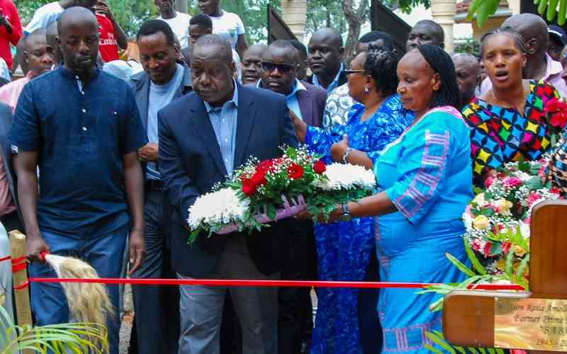 Former Interior Cabinet Secretary Fred Matiang’i lays a wreath on the grave of former Prime Minister Raila Odinga in Kang'o Ka Jaramogi, Bondo, on October 27, 2025. [Michael Mute, Standard]