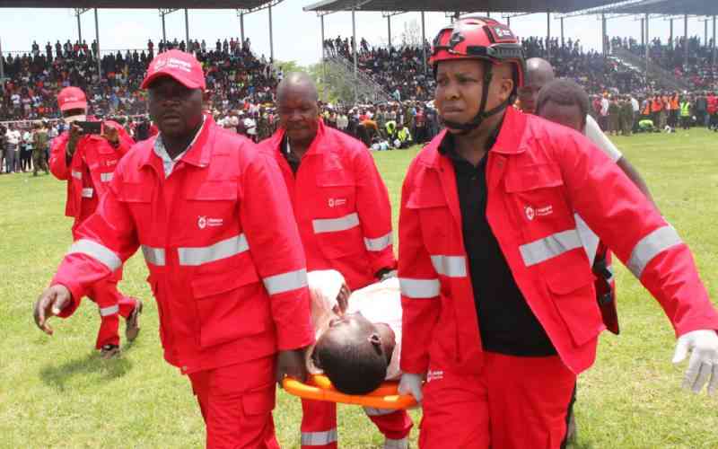 Red Cross medics attend to mourners who fainted during the public viewing of former Prime Minister Raila Odinga’s body in Kisumu. [Rodgers Otiso, Standard]